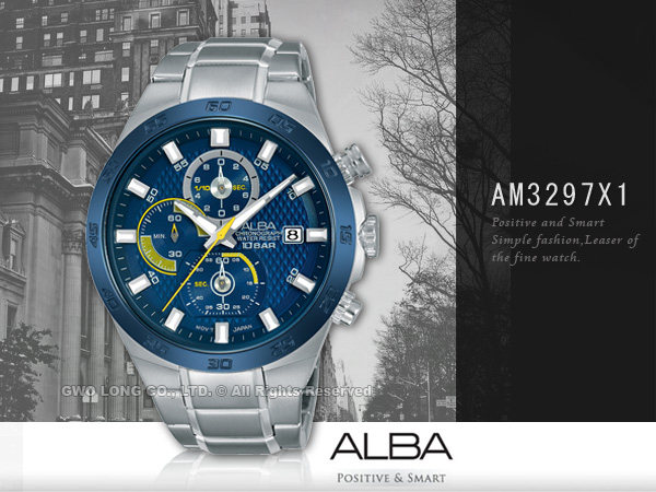 AM3297X1 ALBA 三眼計時男錶 不鏽鋼錶帶 藍+黃 防水100米 分段時間 日期顯示