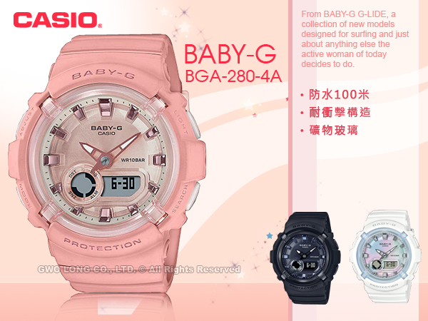BGA-280-4A CASIO BABY-G 運動型設計 雙顯女錶 珊瑚粉 橡膠錶帶 防水100米 BGA-280