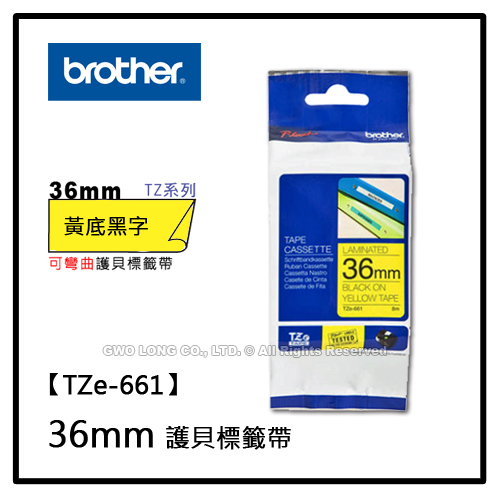 TZe-661 36mm BROTHER 黃底黑字 護貝標籤機色帶 耗材
