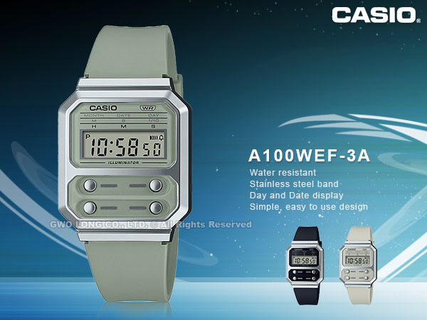 A100WEF-3A CASIO 電子錶 膠質錶帶 墨綠復古 LED照明 日常生活防水 A100W