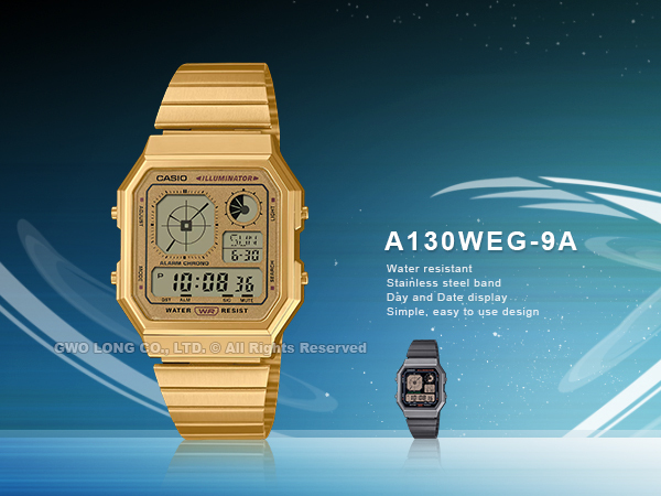 A130WEG-9A CASIO 金色復古 電子錶 不鏽鋼錶帶 多城市時間 生活防水 鬧鈴碼表 A130WE