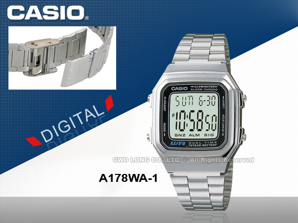 CASIO A178WA系列以方型極簡造型,不鏽鋼錶帶呈現出整體質感,全系列具備生活防水、1/100秒計時碼表、鬧鈴、LED背光照明、全自動月曆、12/24制切換等多項功能。