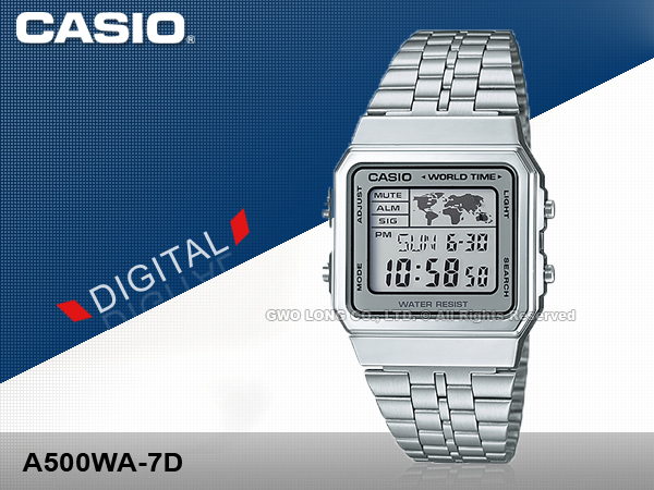 復古風數字錶A500WA/A500WGA,採用復刻的方型錶殼設計,液晶上方特別設計全球地圖,可同步顯示所選擇時區的位置,並內建31時區(48城市)的世界時間,此外還有LED照明、1/100秒碼表、倒數計時、5組鬧鈴...等多項豐富機能,A500WA為銀色不鏽鋼錶帶,而A500WGA則為金色不鏽鋼錶帶。
