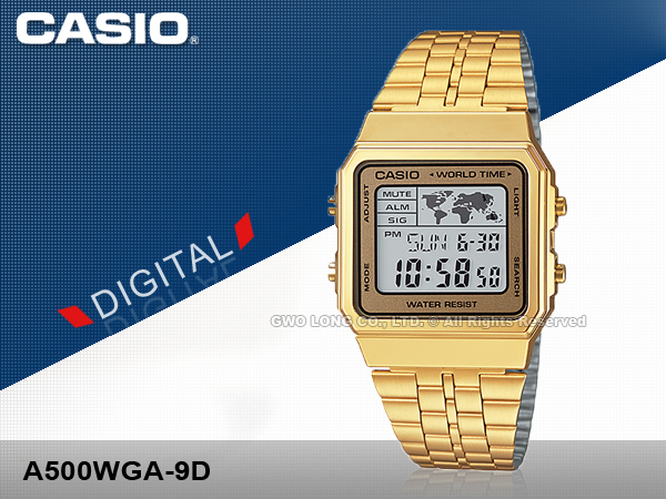 復古風數字錶A500WA/A500WGA,採用復刻的方型錶殼設計,液晶上方特別設計全球地圖,可同步顯示所選擇時區的位置,並內建31時區(48城市)的世界時間,此外還有LED照明、1/100秒碼表、倒數計時、5組鬧鈴...等多項豐富機能,A500WA為銀色不鏽鋼錶帶,而A500WGA則為金色不鏽鋼錶帶。