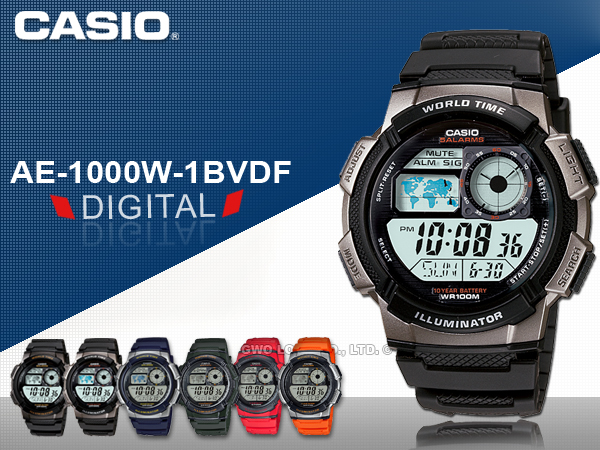 AE-1000W-1B CASIO 電子錶 中性錶 橡膠錶帶 防水100米 自動LED照明 碼錶 鬧鈴