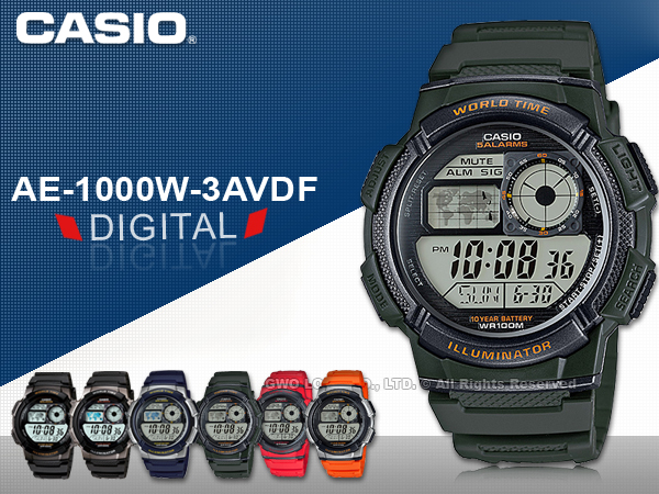 AE-1000W-3AVDF CASIO 電子錶 中性錶 橡膠錶帶 防水100米 自動LED照明 碼錶 鬧鈴