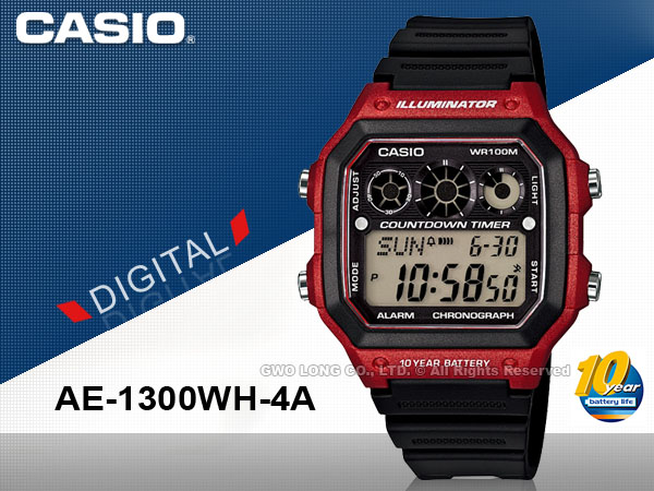AE-1300WH-4A CASIO 電子錶 橡膠錶帶 計時碼錶 防水100米 LED照明