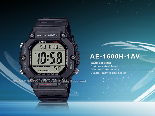 AE-1600H-1A CASIO 運動電子男錶 霧黑 膠質錶帶 防水100米 LED照明 AE-1600H