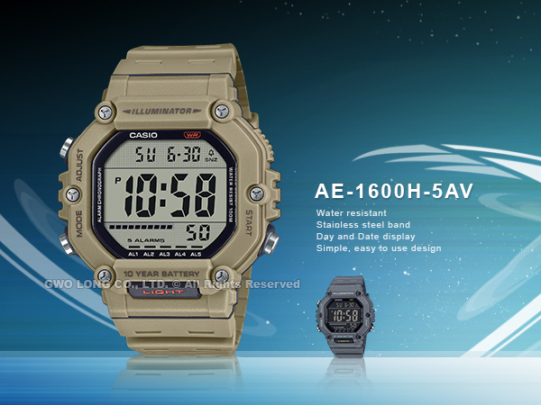 AE-1600H-5A CASIO 運動電子男錶 沙漠棕 膠質錶帶 防水100米 LED照明 AE-1600H
