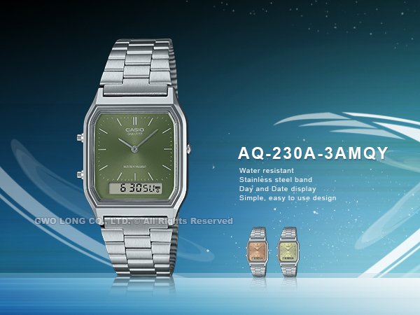 AQ-230A-3A CASIO 復古潮流 雙顯錶 墨綠 不鏽鋼錶帶 生活防水 每日鬧鈴 AQ-230A