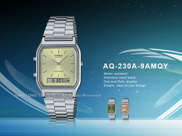 擁有數字與指針雙重顯示的 AQ-230系列,搭配質感不鏽鋼錶帶,具日常生活防水、每日鬧鈴、兩地時間等實用功能,復古設計的方形錶面設計,為整體更添時尚潮流風格。