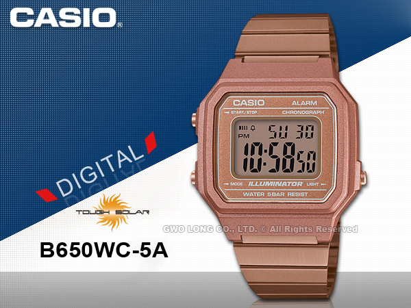 復古文青風的大型數字顯示錶款,共有三種配色選擇,包含黑色、銀色及玫瑰金,全系列為不鏽鋼錶帶,其中B650WB及B650WC錶帶分別利用黑色及玫瑰金IP處理完成,全系列具備50米防水、1/100秒秒錶、每日鬧鐘、LED背光等多項功能。