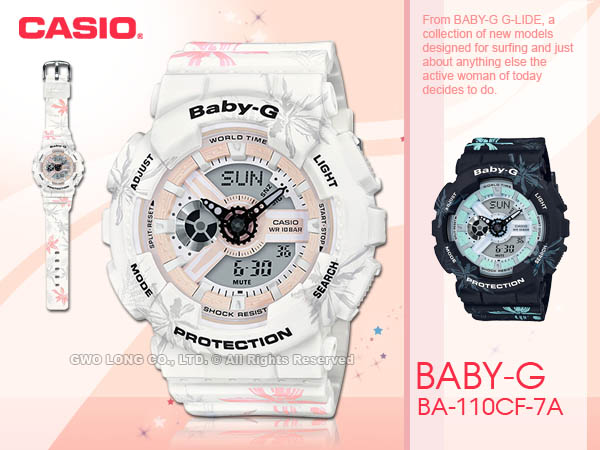 BABY-G針對夏季以美國西岸海灘風情為主題推出全新系列,型號包含由G-SHOCK熱銷錶款GA-110縮小而來的BA-110及經典不敗款BGD-560,提供簡約易搭配的黑、白兩色選擇,外表皆印上粉嫩色系的花卉圖案,並經過特殊處理,打造出霧面質感外觀,此系列適合搭配海灘造型或整個夏季配戴。