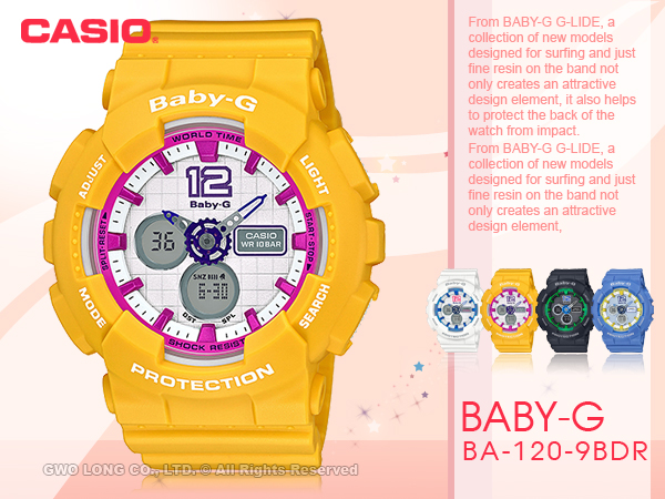 BA-120-9BDR CASIO BABY-G 啦啦隊運動背號風格雙顯女錶 橡膠錶帶 黃x桃紅 防水100米