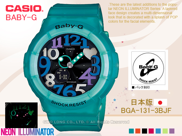 BGA-131-3BJF CASIO BABY-G 氣霓虹照明系列雙顯女錶 橡膠錶帶 湖水綠 防水100米 日本版