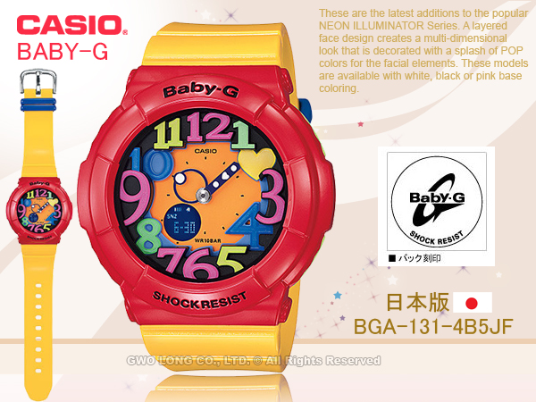 BGA-131-4B5JF CASIO BABY-G 氣霓虹照明系列雙顯女錶 橡膠錶帶 黃X紅 防水100米 日本版