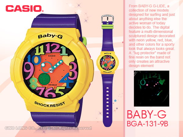 BGA-131-9BDR CASIO BABY-G 人氣霓虹照明系列雙顯女錶 橡膠錶帶 黃X紫 防水100米