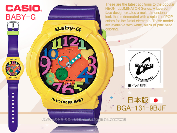 BGA-131-9BJF CASIO BABY-G 人氣霓虹照明系列雙顯女錶 橡膠錶帶 黃X紫 防水100米 日本版