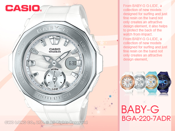 全新BGA-220系列延續運動時尚風潮,以海灘豪華露營為設計概念,採用不鏽鋼材質錶圈,搭配樹脂錶帶,並以指針/數位雙顯設計,輕鬆顯示潮汐、溫度、時間…等各項資訊,並具備防水200米規格,打造海灘時尚新風貌。錶圈採用獨特多角的12邊形造型,表層以髮絲紋揉合鏡面拋光邊緣,搭配3D立體整點時刻設計,讓漫步在海灘的妳,舉手投足間自然散發優雅氣息。