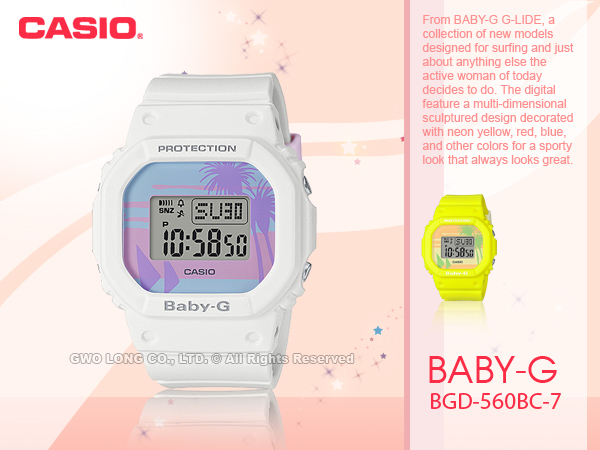BABY-G推出全新80年代彩色系列,以捕捉1980年代美國西岸的海灘風情。選用帶點復古感的BGD-560與BGD570為基礎錶款,並以80年代受歡迎的白、黃、粉綠、粉紅色為主色調,錶盤印有熱帶風情棕櫚樹和夕陽西落的美麗暮色圖樣,營造出帶點復古的懷舊風情,讓人懷念夏日陽光下的海灘風景。