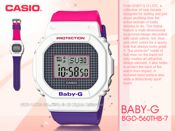 以格紋線條搭配復古桃紅、亮紫與白色的BGD-560THB與BGD-570THB系列,設計靈感來自於90年代的復古運動服飾配色,特別選用經典數位顯示錶款BGD-560與BGD-570,錶盤為黑色配上白色格紋線條設計,白色錶殼混搭桃紅與亮紫的錶帶,上下錶帶的撞色設計充滿活潑感,錶盤與錶殼細節處也延用桃紅與亮紫的設計,處處展現出90年代的特有的復古氛圍。可分別與DW-5600THB及DW-5700THB組成情侶對錶,在寒冬中訴說著彼此濃濃不絕的情意。