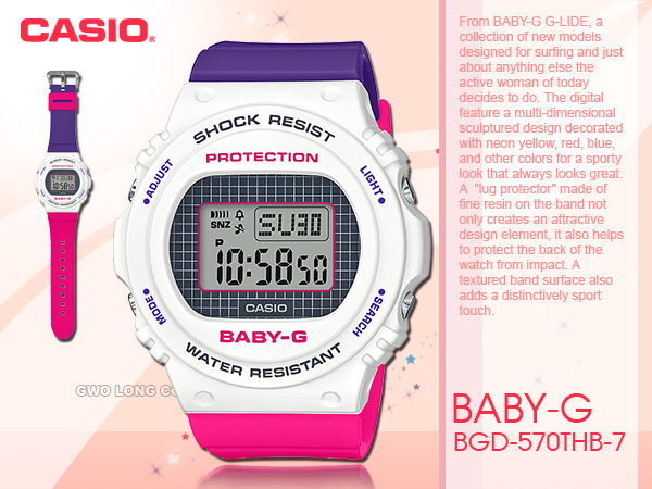 以格紋線條搭配復古桃紅、亮紫與白色的BGD-560THB與BGD-570THB系列,設計靈感來自於90年代的復古運動服飾配色,特別選用經典數位顯示錶款BGD-560與BGD-570,錶盤為黑色配上白色格紋線條設計,白色錶殼混搭桃紅與亮紫的錶帶,上下錶帶的撞色設計充滿活潑感,錶盤與錶殼細節處也延用桃紅與亮紫的設計,處處展現出90年代的特有的復古氛圍。可分別與DW-5600THB及DW-5700THB組成情侶對錶,在寒冬中訴說著彼此濃濃不絕的情意。