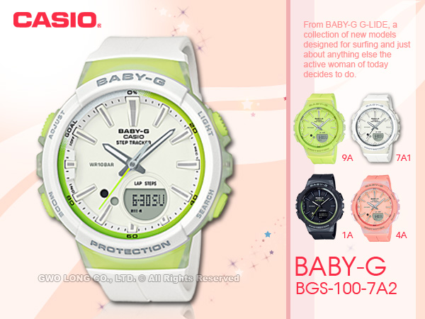 BGS-100-7A2 CASIO BABY-G 輕巧計步雙顯女錶 橡膠錶帶 白X綠 計步功能