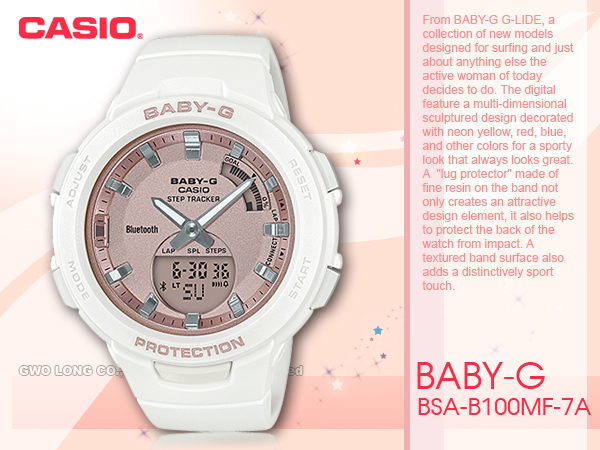 BABY-G G-SQUAD系列推出全新配色BSA-B100MF,提供基本的黑白兩色選擇,錶面以流行的玫瑰金設計,搭配金屬整點時刻,為日常運動和訓練時增添時尚風格,功能上搭載BLUETOOTHR藍牙連線功能,專為熱愛運動的女性所設計,下載BABY-G Connected※1專屬APP後,能輕鬆紀錄日常鍛鍊成果、方便日常的健康管理,錶款採用最新的三軸加速傳感器,步數顯示範圍可達到999,999,不論是步行步數或跑步速度,都可將數據傳送到APP上,並透過CASIO最新開發的演算法,根據數據分析出五種代謝當量※2(Metabolic Equivalent of Task,MET)等級,並按照MET級別(日/週/月)製成詳細的圖表分析,而當使用者攜帶智慧型手機運動時,使用者可透過APP隨時查看當前步數、運動地點、時間及卡路里消耗…等數據,除了精準的步伐計算,更提供了20組計時組合(每5組計時為一組),包含200組圈速記憶空間,完整的將計時組合、碼錶測量等數據傳送至手機,幫助計畫與紀錄運動成果,協助達成鍛鍊目標,此外,還提供聲效提醒功能,特定時間內沒有達到目標步數時將發出提醒聲,其他功能包含歷史資料查詢、每日自動更新四次的時間資訊等等。