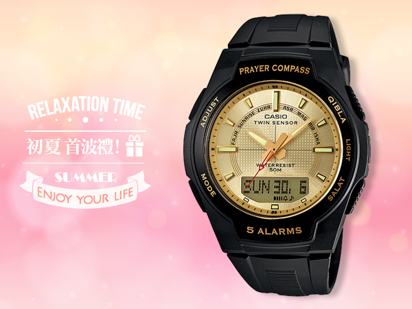 新的數字結合專門設計與伊斯蘭旅客心中的選擇。每支都有內建的祈禱羅盤和其他功能,按下一個按鈕,使秒針指向朝拜,並採用數字顯示和秒針的5個禱告時間可確定為當前日期。你甚至可以設定用於其它日期的祈禱時間。CPW-500H系列除了簡單的朝拜功能和禱告的時間顯示功能,其他功能還包括整點報時,加上雙傳感器,方向和溫度,月齡顯示,5個每日鬧鈴,秒錶1/100-second,和100分鐘的倒計時計時器(以1秒為單位)及數位羅盤模式