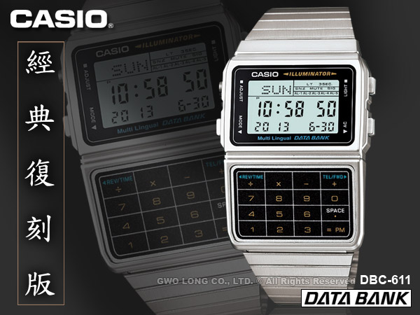 CASIO經典錶款DATABANK計算機系列錶款DBC-611,內建25組的電話記憶、備忘錄與8位數計算機功能,還有兩地時間、碼錶、鬧鈴…等多樣化機能,是復古潮流風必備配件之一。