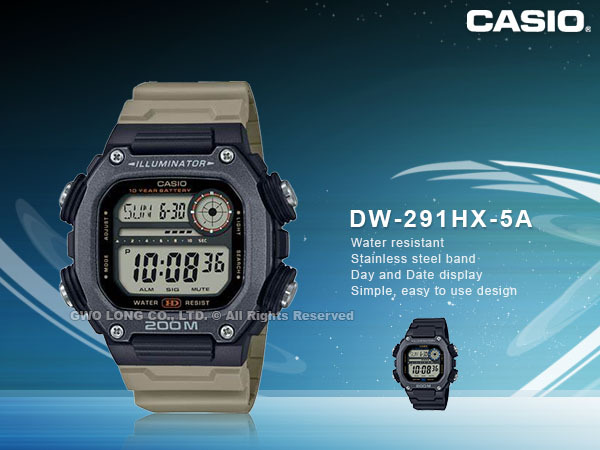 DW-291HX-5A CASIO男錶 運動電子錶 軍綠 加長錶帶 防水200米 碼錶 LED照明 DW-291H