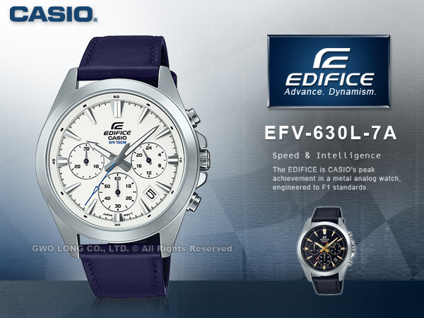 隆重呈獻 EDIFICE EFV-630L — 經典計時碼錶,充滿運動風格且設計簡約,配襯皮錶帶,散發時尚氣息。