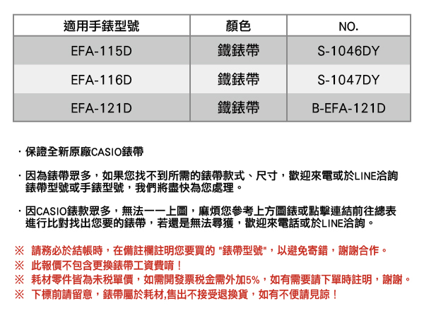 CASIO 鐵錶帶 EFA-115D / EFA-116D / EFA-121D 原廠鐵錶帶