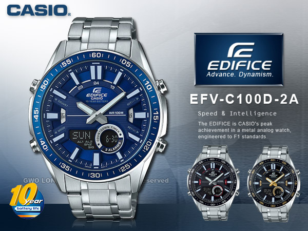 EFV-C100D-2A CASIO EDIFICE 雙顯男錶 不鏽鋼錶帶 藍面 100米防水