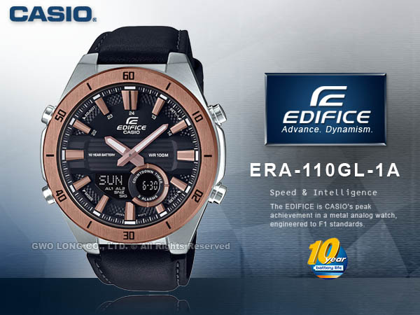 ERA-110GL-1A CASIO EDIFICE 雙顯男錶 皮革錶帶 黑X玫瑰金 防水100米 電話備忘錄