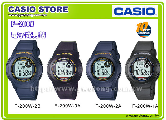 電子運動錶F-200系列採用流線酷炫設計,全系列功能搭載全自動日曆、世界時間、計時碼錶、鬧鈴、夜間照明等等,兼具外型與實用功能的運動錶款。