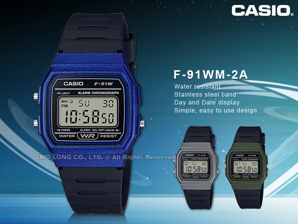 CASIO F-91WM 全新系列外觀以復古造型設計,方型的錶殼提供銀色或金色的選擇,簡約的設計讓各種穿搭風格皆能搭配,全系列皆為樹脂材質錶帶,並具備生活防水、1/100秒計時碼表、每日鬧鈴、LED背光照明、全自動月曆、12/24小時制切換等多項功能。