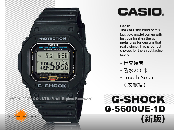 G-5600UE-1D CASIO G-SHOCK 電子錶 經典太陽能錶 全新版 膠質錶帶 LED 防水200米 G-5600E