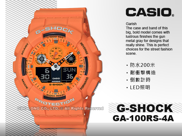 GA-100RS-4A CASIO 搖滾復古電子錶 樹脂錶帶 活力橙 防水200米