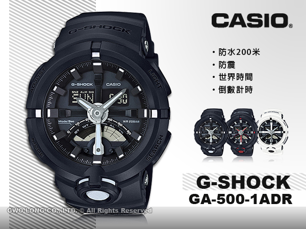 G-SHOCK全新設計GA-500系列,以城市運動為設計靈感,採用G-SHOCK全新樹脂成型技術,創造了獨特流線型外觀,全系列包含純黑、純白及黑紅三種色系選擇,前衛時尚的渾圓大錶殼設計及獨特十字分割錶盤,是以公路車齒輪改裝為設計概念,為手錶注入運動元素,3D多層次錶面搭載反轉液晶顯示和指針的雙顯功能,方便閱讀各項時間資訊,所有功能按鍵傾斜縮小的設計,以減少與手腕的接觸,增加使用舒適度,六點鐘方向的大型按,可快速啟動或停止碼錶功能,扇型錶眼為多功能逆跳指針和液晶顯示,並特別採用雙線圈馬達,讓錶眼的功能切換運作更為流暢,貼心的指針移動設計,當使用計時相關功能時,指針可手動避開液晶區域,讓使用者閱讀各種資訊時更加直覺與便利。除了G-SHOCK既有耐震、防水200米外,還搭載1/100秒計時碼錶、倒數計時器、世界時間,其中碼錶特別搭配目標時間的鬧鈴提醒功能。全新的GA-500整體外觀簡潔大方卻不失設計感,融合前衛時尚與運動風格,沉穩特質與速度感完整呈現。
