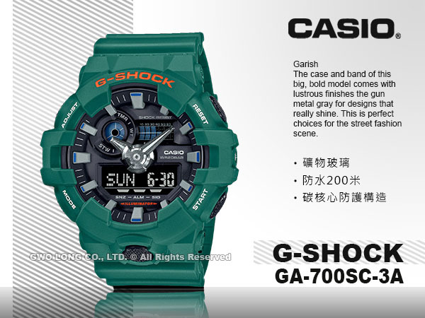 GA-700SC-3A CASIO G-SHOCK 雙顯男錶 樹脂錶帶 深綠色 防水200米 GA-700SC