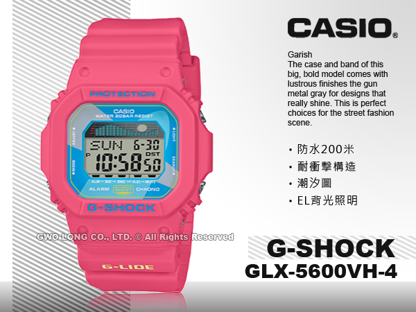 GLX-5600VH-4 CASIO 復古衝浪電子男錶 橡膠錶帶 桃紅 潮汐圖 防水200米