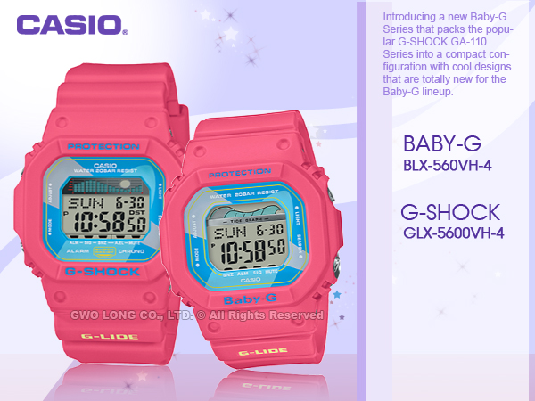 GLX-5600VH-4+BLX-560VH-4 CASIO 復古衝浪情侶電子對錶 橡膠錶帶 桃紅 潮汐圖 防水200米
