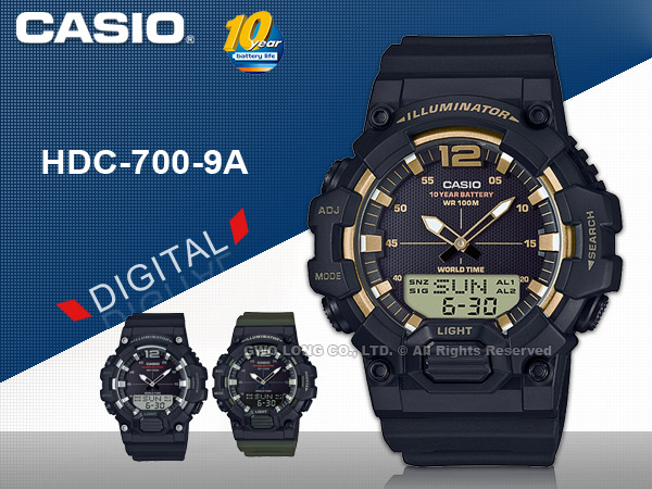 HDC-700-9A CASIO 雙顯錶 橡膠錶帶 樹脂玻璃 防水100米 LED照明