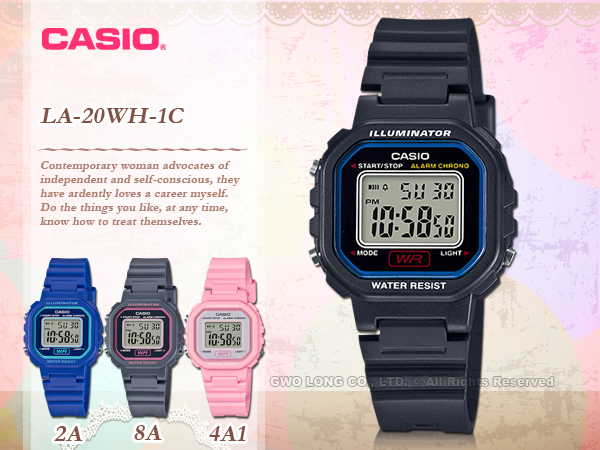 帶點復古風的方形電子錶款LA-20WH系列,小巧的方形錶面設計,其中LW-20WH-1B液晶顯示採用反轉液晶顯示,與黑色錶帶搭配出整體感。此外,錶面也有女性化的桃紅與金色的選擇。內建1/100秒碼表、鬧鈴與LED照明、生活防水。