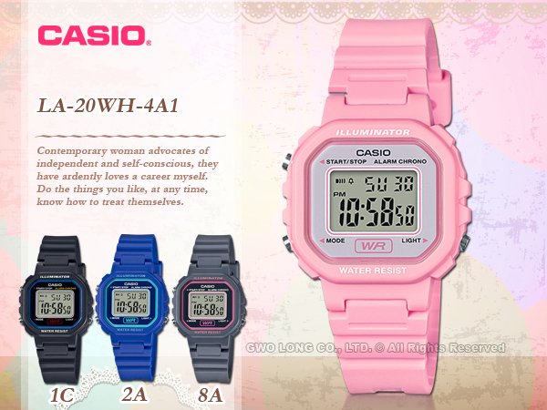 帶點復古風的方形電子錶款LA-20WH系列,小巧的方形錶面設計,其中LW-20WH-1B液晶顯示採用反轉液晶顯示,與黑色錶帶搭配出整體感。此外,錶面也有女性化的桃紅與金色的選擇。內建1/100秒碼表、鬧鈴與LED照明、生活防水。
