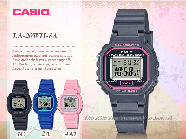 帶點復古風的方形電子錶款LA-20WH系列,小巧的方形錶面設計,其中LW-20WH-1B液晶顯示採用反轉液晶顯示,與黑色錶帶搭配出整體感。此外,錶面也有女性化的桃紅與金色的選擇。內建1/100秒碼表、鬧鈴與LED照明、生活防水。