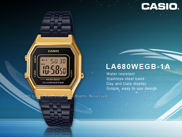 CASIO推出全新電子錶款LA670WEGB/ LA680WEGB系列,外觀以黑金設計為主,黑色的不鏽鋼錶帶搭配復古的方型金色錶殼,分別有28和24mm兩種尺寸選擇,全系列具備生活防水1/10(LA670WEGB)或1/100(LA680WEGB)秒計時碼表、倒數計時(LA670WEGB)、每日鬧鈴、LED背光照明(LA680WEGB)、全自動月曆等多項功能。