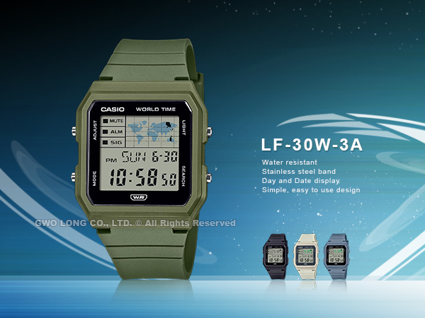 LF-30W-3A CASIO 卡西歐 復古電子錶 軍綠色 世界地圖 鬧鈴碼表 生活防水 LF-30W