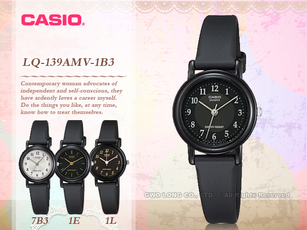 CASIO推出指針女錶LQ-139AMV系列,採用黑色系樹脂錶帶設計,錶面設計簡單且直覺易讀,兼具外型與實用性。